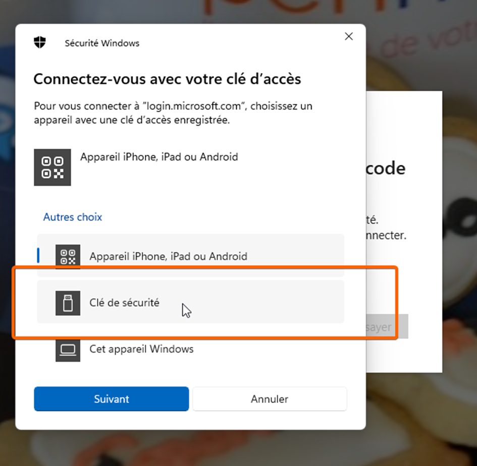 Sur un poste où Windows Hello n’est pas configuré, l’utilisateur peut sélectionner « Autres modes de connexion » puis « Clé de sécurité ».