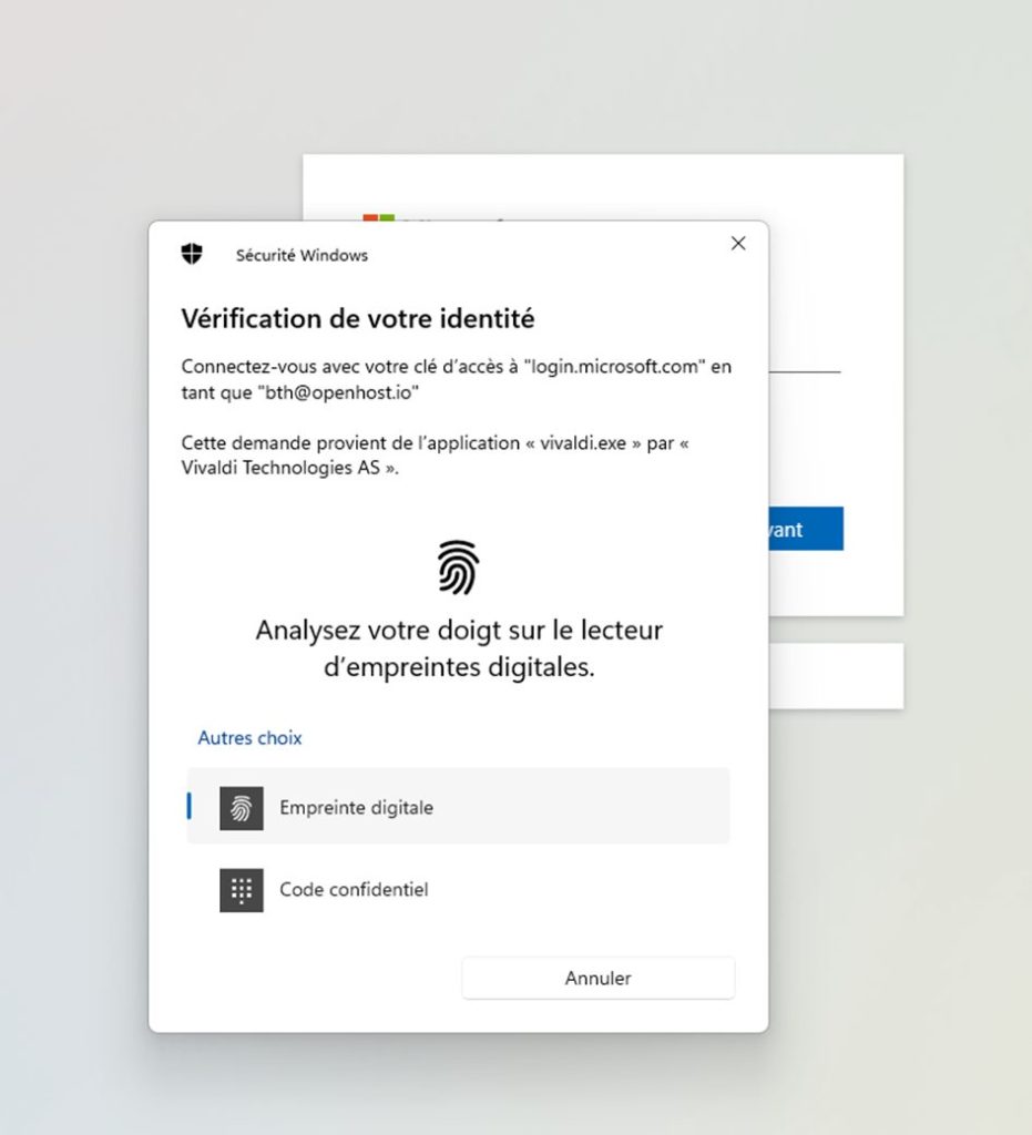 Au moment de se connecter, Windows détecte ta clé d’accès (Windows Hello).